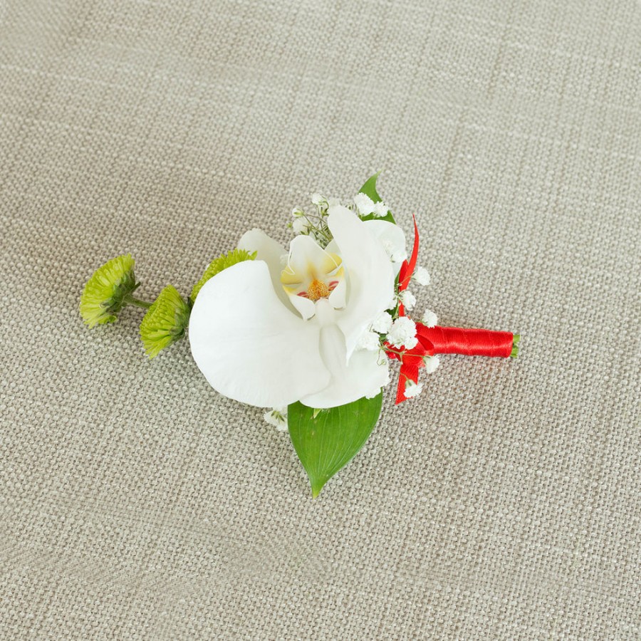 Our refined groom buttonhole is the perfect accessory to complete the groom's look, featuring a graceful mix of white orchids, green mini chrysanthemums, and gypsophila, elegantly secured with a red ribbon.
